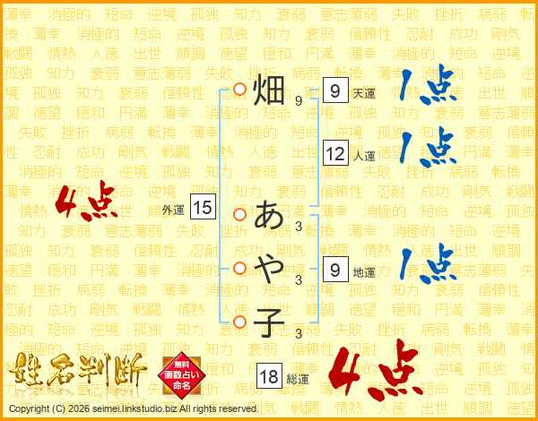 畑あや子さんの総運は18画の4点!