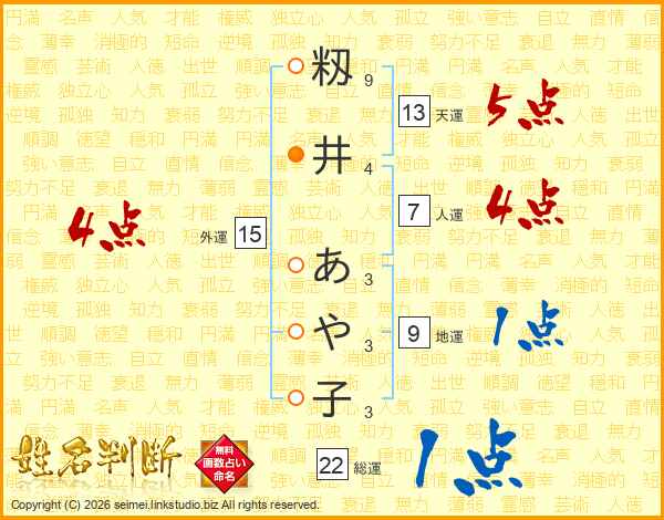 籾井あや子さんの外運は15画の4点!