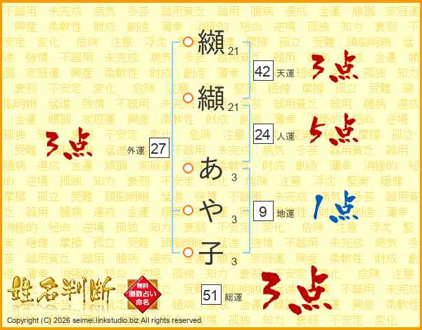 纐(21画)纈(21画) あ(3画)や(3画)子(3画)