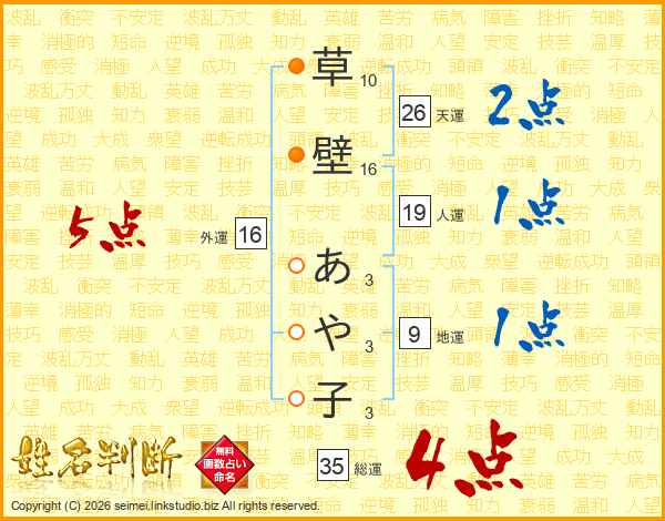 草(10画)壁(16画) あ(3画)や(3画)子(3画)