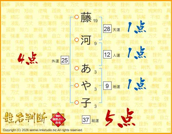 藤(19画)河(9画) あ(3画)や(3画)子(3画)