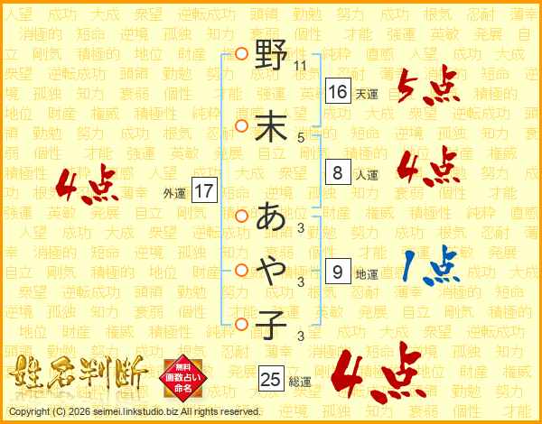 野(11画)末(5画) あ(3画)や(3画)子(3画)
