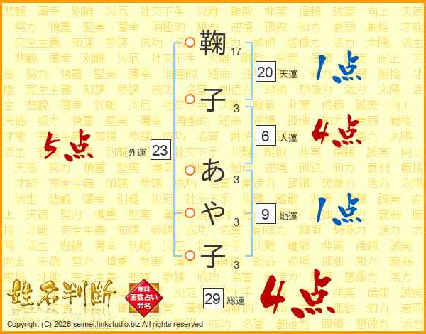 鞠子あや子さんの総運は29画の4点!
