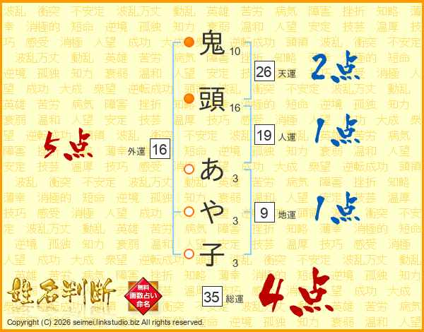 鬼(10画)頭(16画) あ(3画)や(3画)子(3画)