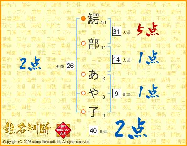 鰐部あや子さんの天運は31画の5点!