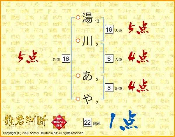 湯川あやさんの天運は16画の5点!