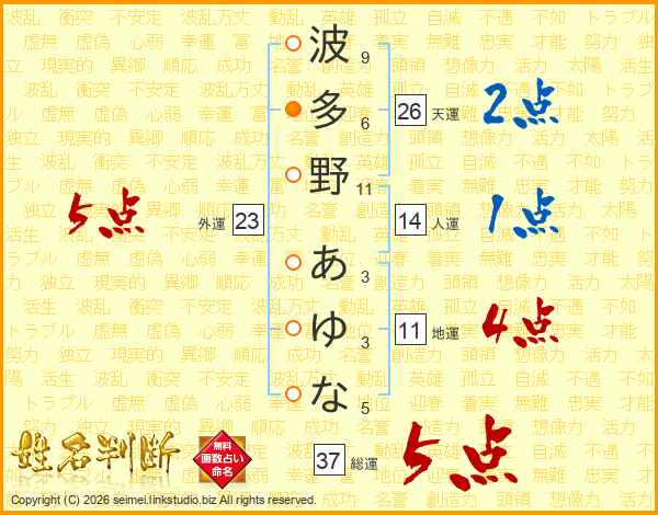 波(9画)多(6画)野(11画) あ(3画)ゆ(3画)な(5画)