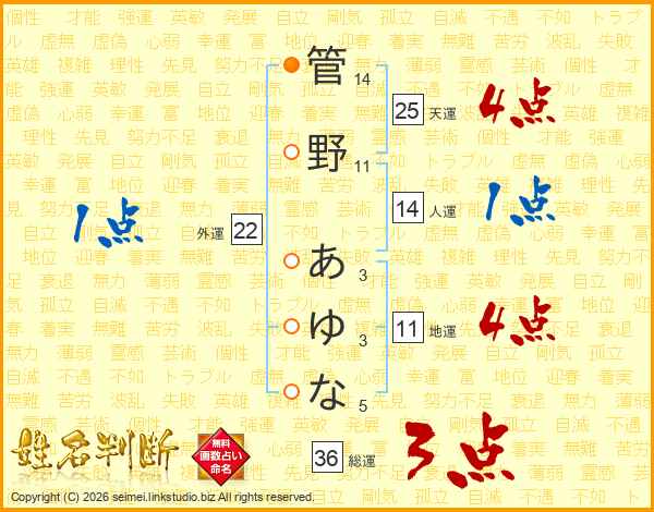 生活面を象徴する運勢です。外部から受ける影響力を表し、結婚運、家庭運や職場、環境への順応性を表します。総運から人運を引いた画数。姓や名が1文字の場合を除く。