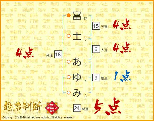 富(12画)士(3画) あ(3画)ゆ(3画)み(3画)