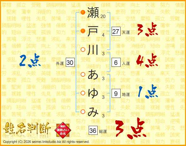 瀬戸川あゆみさんの総運は36画の3点!