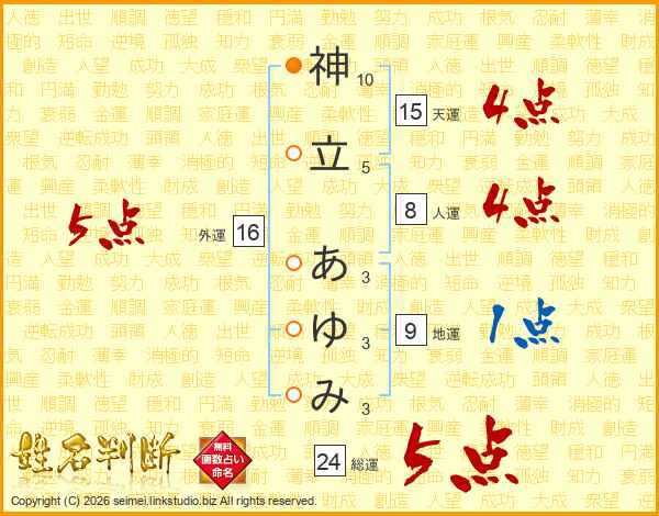 神(10画)立(5画) あ(3画)ゆ(3画)み(3画)