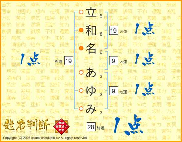 立(5画)和(8画)名(6画) あ(3画)ゆ(3画)み(3画)