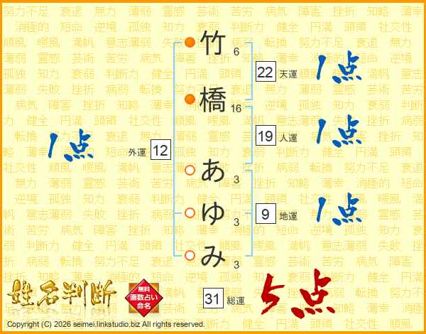 竹(6画)橋(16画) あ(3画)ゆ(3画)み(3画)