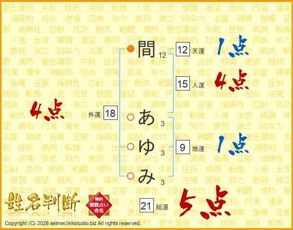 間あゆみさんの総運は21画の5点!