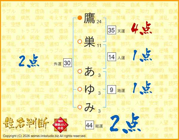 鷹(24画)巣(11画) あ(3画)ゆ(3画)み(3画)