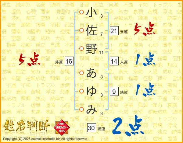 小(3画)佐(7画)野(11画) あ(3画)ゆ(3画)み(3画)