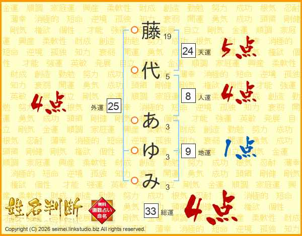 藤(19画)代(5画) あ(3画)ゆ(3画)み(3画)