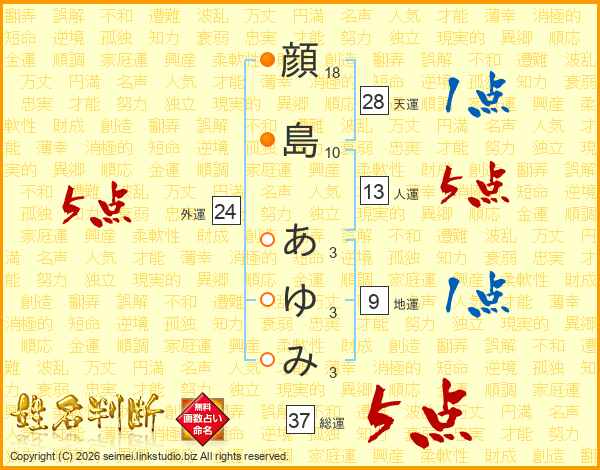 顔(18画)島(10画) あ(3画)ゆ(3画)み(3画)
