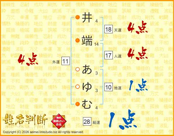 井(4画)端(14画) あ(3画)ゆ(3画)む(4画)