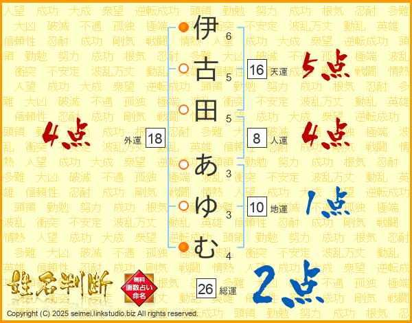 伊(6画)古(5画)田(5画) あ(3画)ゆ(3画)む(4画)