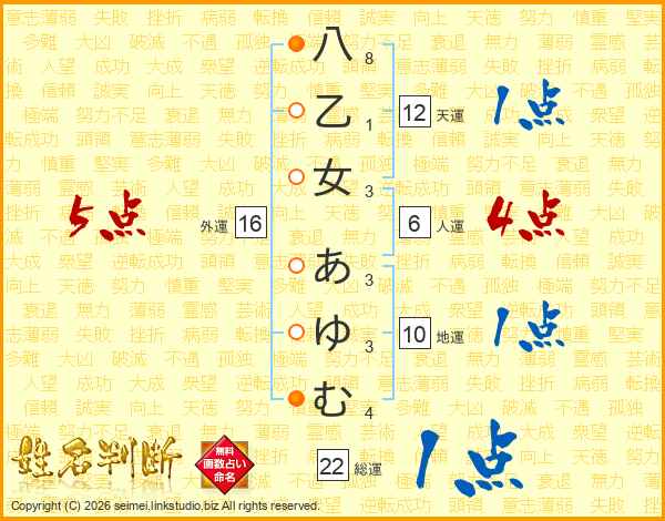 八(8画)乙(1画)女(3画) あ(3画)ゆ(3画)む(4画)