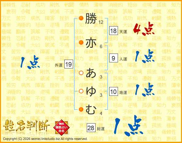 勝(12画)亦(6画) あ(3画)ゆ(3画)む(4画)