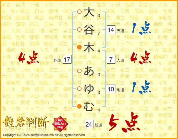 生活面を象徴する運勢です。外部から受ける影響力を表し、結婚運、家庭運や職場、環境への順応性を表します。総運から人運を引いた画数。姓や名が1文字の場合を除く。
