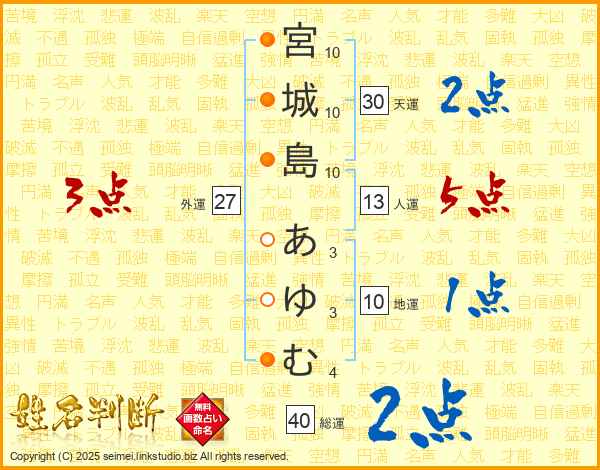 生活面を象徴する運勢です。外部から受ける影響力を表し、結婚運、家庭運や職場、環境への順応性を表します。総運から人運を引いた画数。姓や名が1文字の場合を除く。