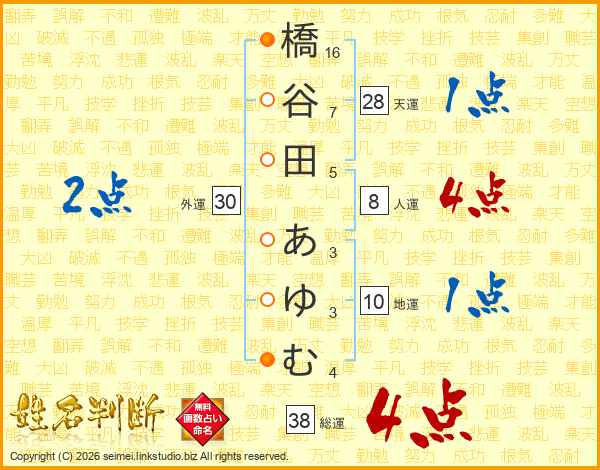 橋谷田あゆむさんの総運は38画の4点!