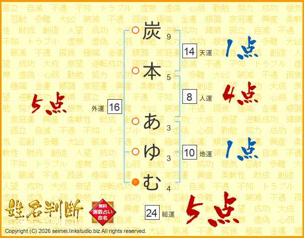 炭(9画)本(5画) あ(3画)ゆ(3画)む(4画)