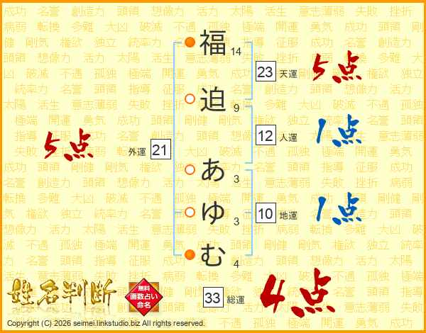 福(14画)迫(9画) あ(3画)ゆ(3画)む(4画)