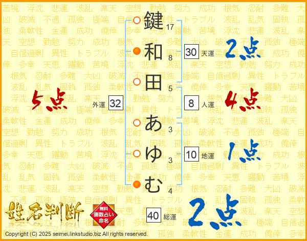 生活面を象徴する運勢です。外部から受ける影響力を表し、結婚運、家庭運や職場、環境への順応性を表します。総運から人運を引いた画数。姓や名が1文字の場合を除く。