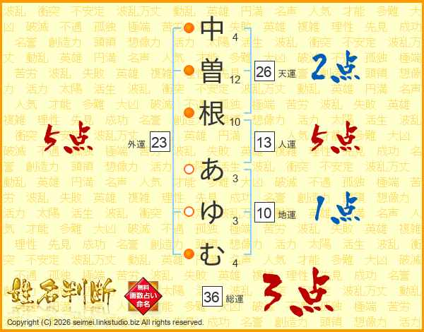 中曽根あゆむさんの人運は13画の5点!