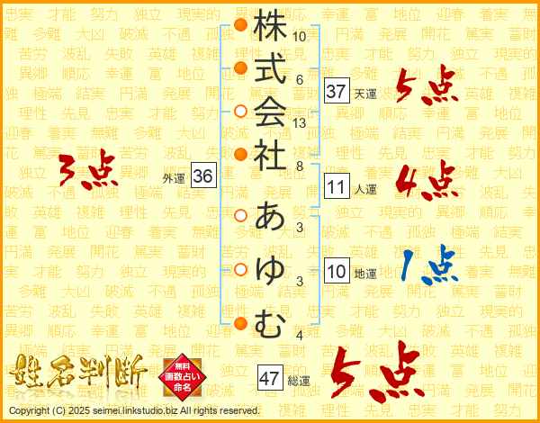 株(10画)式(6画)会(13画)社(8画) あ(3画)ゆ(3画)む(4画)
