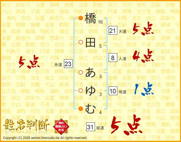 橋(16画)田(5画) あ(3画)ゆ(3画)む(4画)