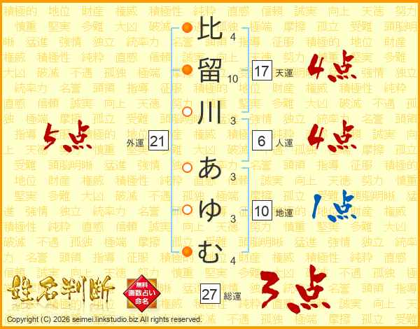 生活面を象徴する運勢です。外部から受ける影響力を表し、結婚運、家庭運や職場、環境への順応性を表します。総運から人運を引いた画数。姓や名が1文字の場合を除く。