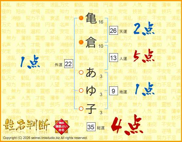 亀(16画)倉(10画) あ(3画)ゆ(3画)子(3画)