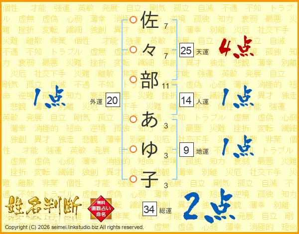 佐々部あゆ子さんの総運は34画の2点!