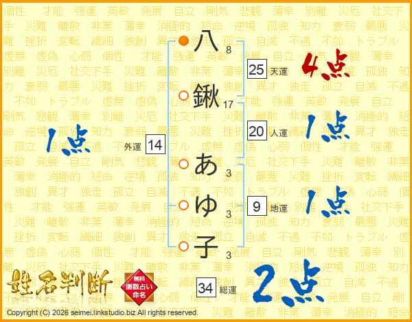 八(8画)鍬(17画) あ(3画)ゆ(3画)子(3画)
