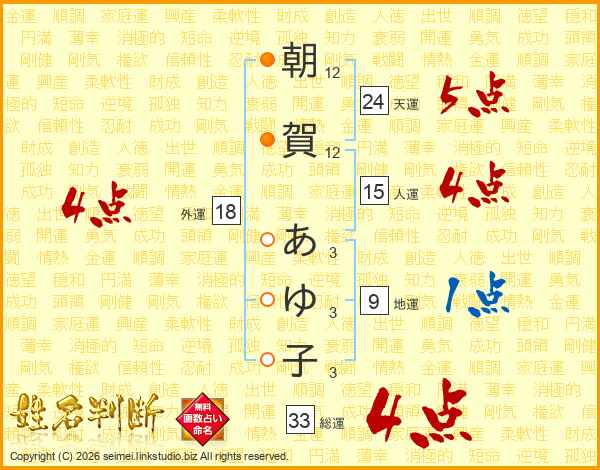 朝(12画)賀(12画) あ(3画)ゆ(3画)子(3画)