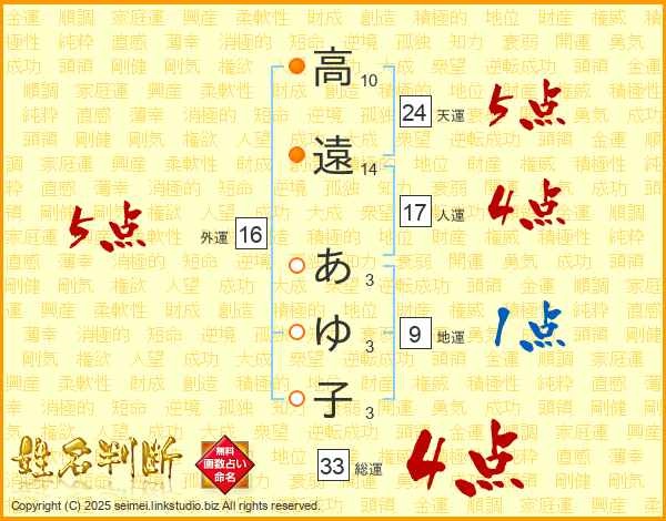 高(10画)遠(14画) あ(3画)ゆ(3画)子(3画)