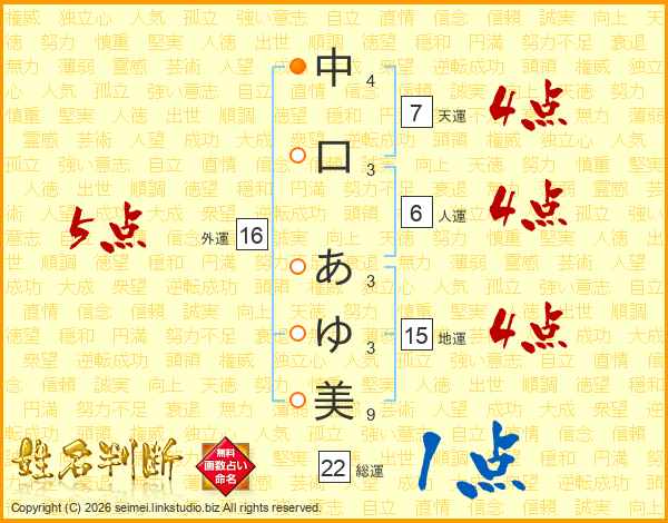 中(4画)口(3画) あ(3画)ゆ(3画)美(9画)