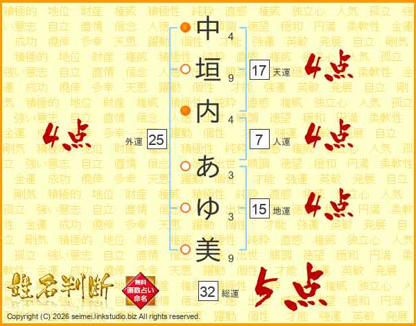 中(4画)垣(9画)内(4画) あ(3画)ゆ(3画)美(9画)
