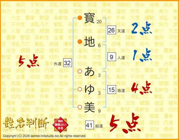 寳(20画)地(6画) あ(3画)ゆ(3画)美(9画)