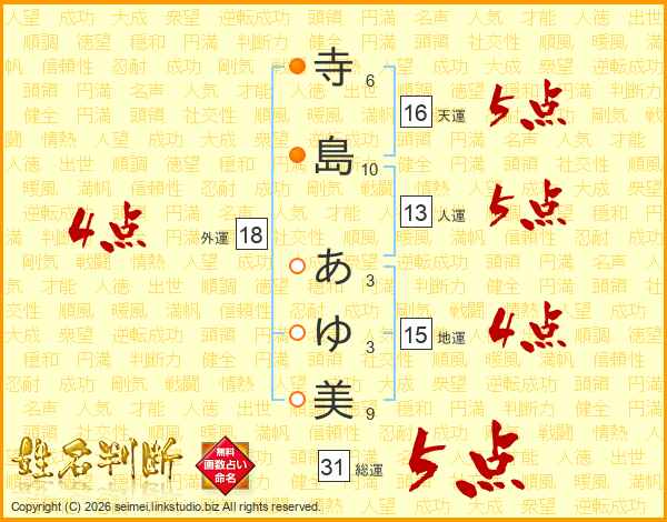 寺(6画)島(10画) あ(3画)ゆ(3画)美(9画)