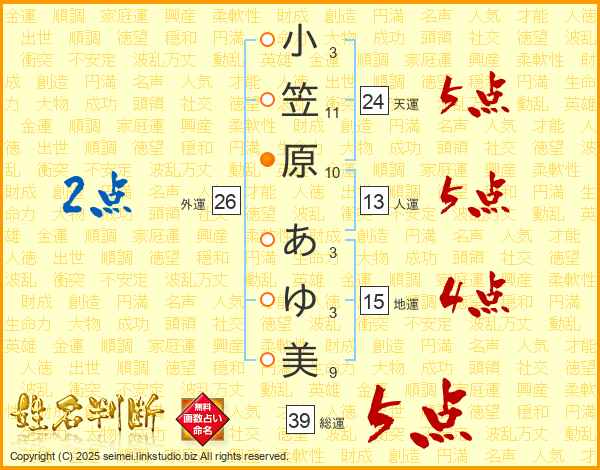 小(3画)笠(11画)原(10画) あ(3画)ゆ(3画)美(9画)