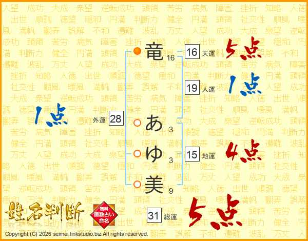 竜あゆ美さんの総運は31画の5点!
