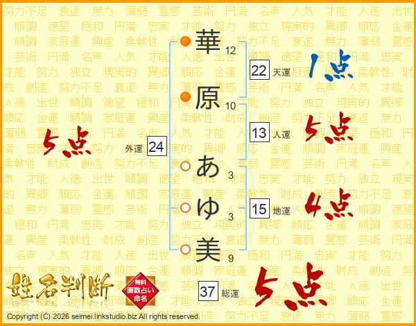 華原あゆ美さんの総運は37画の5点!