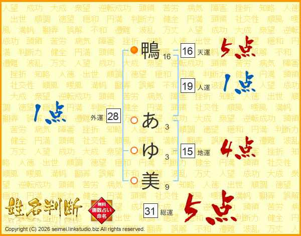 鴨あゆ美さんの総運は31画の5点!