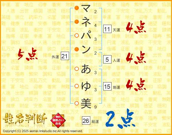 マ(2画)ネ(4画)パ(3画)ン(2画) あ(3画)ゆ(3画)美(9画)